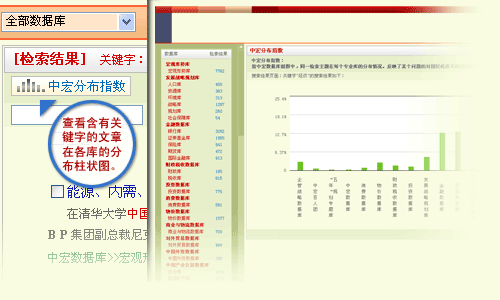 在检索结果页面点击“中宏分布指数”可查看含有关键字的文章在各个大库的分布柱状图,鼠标放置在库名或者柱上,可显示具体数值和百分比。