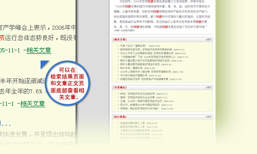 中宏数据库检索系统提供实时的相关文章功能。您可以在文章页面的底部以及检索页面查看。所不同的是文章最终页面查看10 篇相关文章,5篇专家视点、5篇统计数据而检索结果页面查看的是 20 篇相关文章。