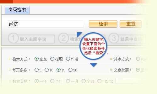在高级检索界面中,有很多特色的功能和自定义选项,您可以定义属于自己的个性化检索。